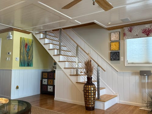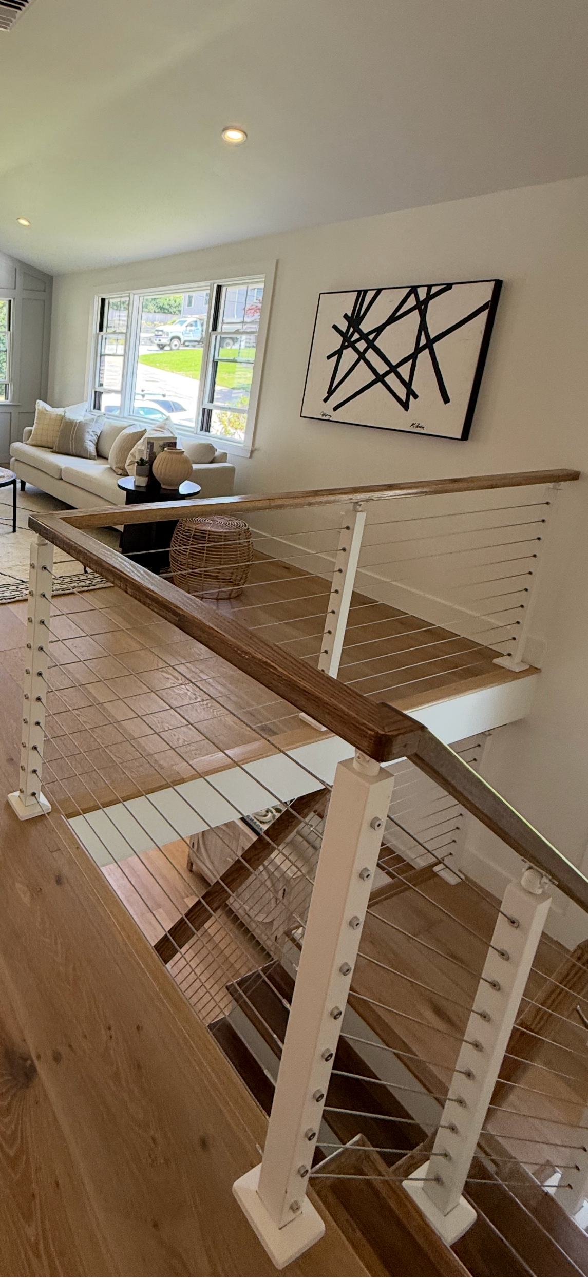 Stainless steel cable railing with wood handrail for stairs, balconies, decks, and more. Get your custom quote today to finish off your dream space.